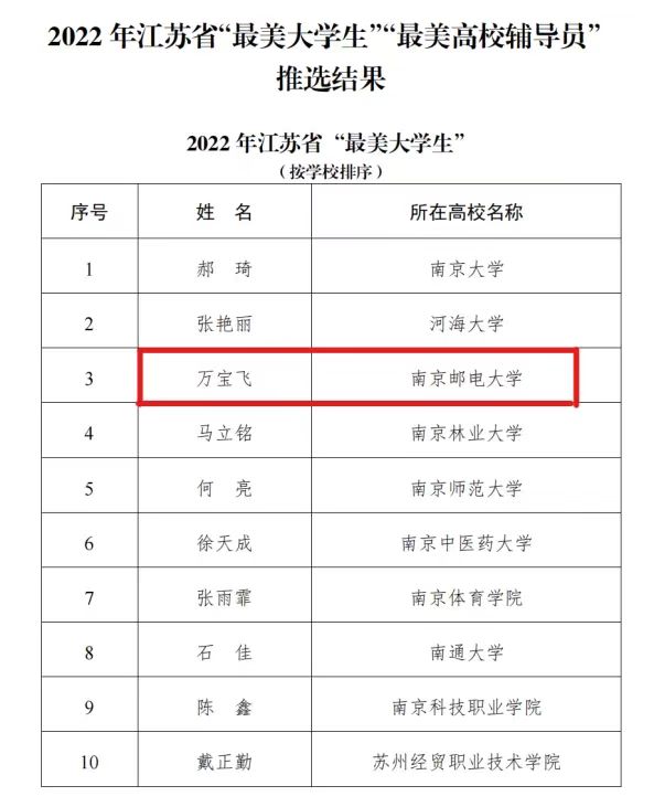 近日,江苏省委教育工委、江苏省教育厅公布第十二届“江苏省大学生年度人物和高校辅导员年度人物”暨2022年“最美大学生”“最美高校辅导员”推选结果,经过学校推荐、材料审核、专家初评、风采展评等多个环节角逐,我校电子与光学工程学院、柔性电子(未来技术)学院2018级本科生万宝飞荣获2022年江苏省“最美大学生”称号(全省共10名),这也是我校连续两年获此殊荣。