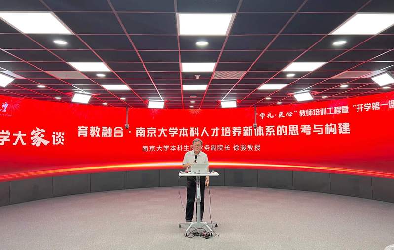 在“教学•大家谈”阶段,南京大学本科生院常务副院长徐骏教授作《育教融合南京大学本科人才培养新体系的思考与构建》主题报告。徐骏教授从新时代发展的要求,详述了在本科人才培养模式、本科人才培养体系改革创新的必要性和实践探索,并讲述了高校加强基层教学组织建设的途径。