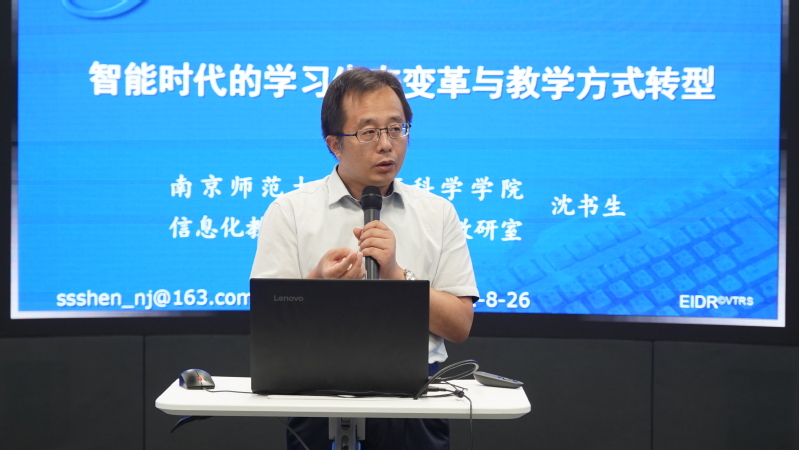 南京师范大学教育科学学院沈书生教授作《智能时代的学习生态变革与教学方式转型》主题报告。他从智能时代的学习新生态和适应新生态的教学转型两个方面,阐述了如何理解教育生态和学习生态,从融合视角下的“大教育”、智能时代教育者的关键素养、信息化变革实践的关键领域、信息化影响个人发展的层次等方面,分析了指向“智慧”的教育过程、体现教育的“智慧”及适应“混合形态”的教学变化。
