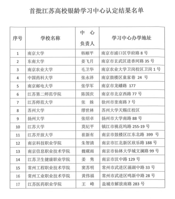 江苏高校银龄学习中心建设工作,是江苏省高等教育学会高校成人教育研究会受江苏省教育厅委托,启动“江苏高校服务老年教育倍增行动计划”的重要举措。首批“江苏高校银龄学习中心”认定共17家单位入选。