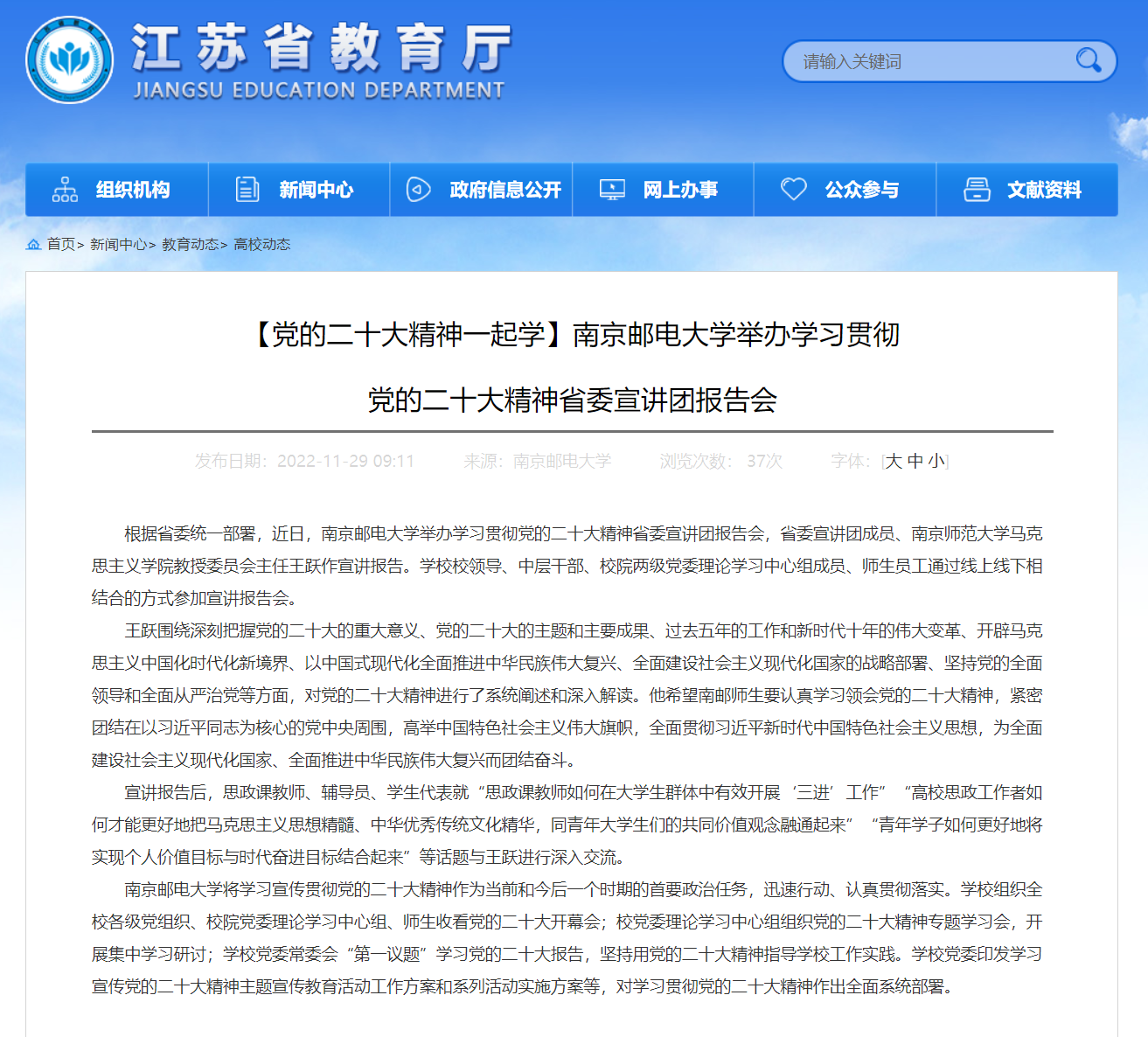 【省教育厅官网】南京邮电大学举办学习贯彻党的二十大精神省委宣讲团报告会