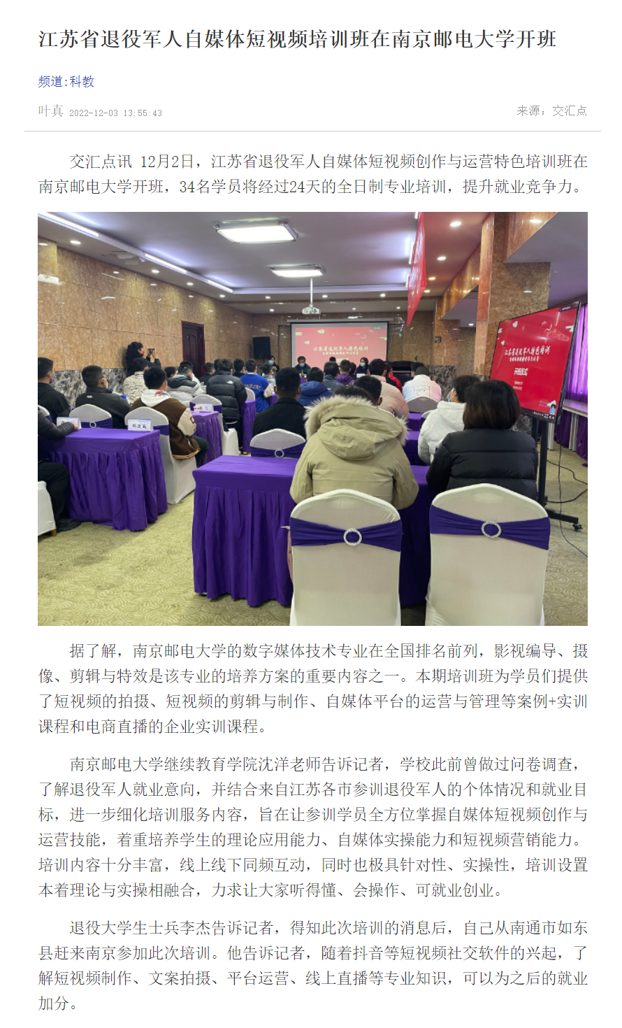 【新华日报客户端】江苏省退役军人自媒体短视频培训班在南京邮电大学开班