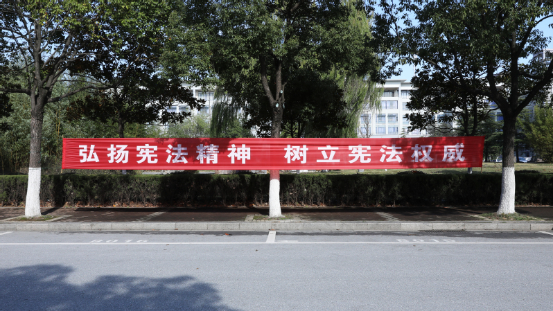 在活动现场,宣传部、法制办公室通过发放宣传材料、宪法讲解、答疑解惑等形式与师生互动交流。校园内也营造了浓厚的贯彻实施宪法的氛围,学校官网主页发布宪法日宣传大图,教学楼、行政楼LED显示屏滚动播放宪法宣传标语,宣传栏张贴宪法宣传海报、悬挂弘扬宪法精神的横幅,制作系列展板,介绍习近平法治思想主要方面的“十一个坚持”,引导师生全面准确把握其精神实质、丰富内涵和核心要义。