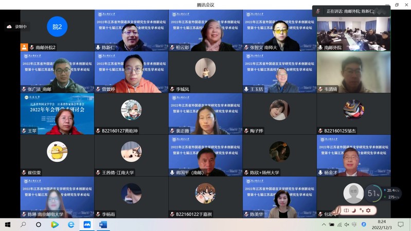 12月3日,江苏省外国语言文学研究生学术创新论坛暨第十七届江苏高校外语专业研究生学术论坛举行。本次论坛由江苏省文学类研究生教育指导委员会、江苏省高等学校外国语教学研究会、江苏省高校外语专业研究生学术论坛组委会主办,我校外国语学院承办。论坛以“新文科·大外语”为主题,采用线上线下结合的方式,省内高校的200余名专家学者、硕博研究生参加。