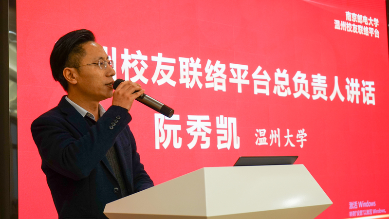 阮秀凯代表温州校友联络平台,对母校领导和各位校友表示热烈欢迎和衷心感谢,并深情回顾了在南邮求学、生活的美好记忆。他表示,温州校友联络平台是校友与母校之间信息交流、感情联络、资源共享的重要纽带,是南邮人共同的精神家园,将秉承着“叙情谊、聚共识、谋发展”的理念,凝心聚力、群策群力,为学校发展汇聚新才智、注入新动能,推动形成优势互补、共创共赢的典型示范。