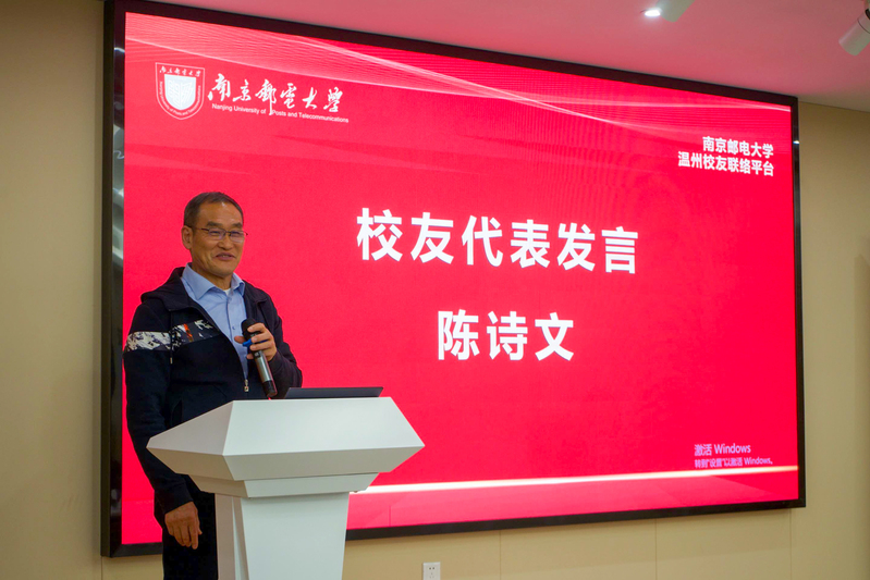 温州联通原副总经理陈诗文校友作为温州校友代表发言。他表示,母校的发展和校友的发展荣辱与共,振兴南邮与每一个南邮校友息息相关,温州校友要与母校一起凝心聚力,讲好校友故事,发挥校友智慧,汇集校友力量,为母校向电子信息领域特色鲜明的高水平大学奋进作出应有的贡献。