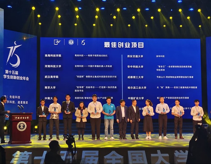 5月12-14日,由教育部主办的第十五届全国大学生创新创业年会在中国矿业大学举行,我校电子与光学工程学院、柔性电子(未来技术)学院赵强教授和王龙禄副教授指导、本科生刘明鸣团队完成的创业实践项目“智能净水——行到水穷处,沁泽千万家”获得“最佳创业项目”,赵强教授和南京水联天下水处理科技研究院有限公司董事长董平获得“优秀指导教师”称号,这是我校首次在全国大学生创新创业年会获得创业类项目奖项。