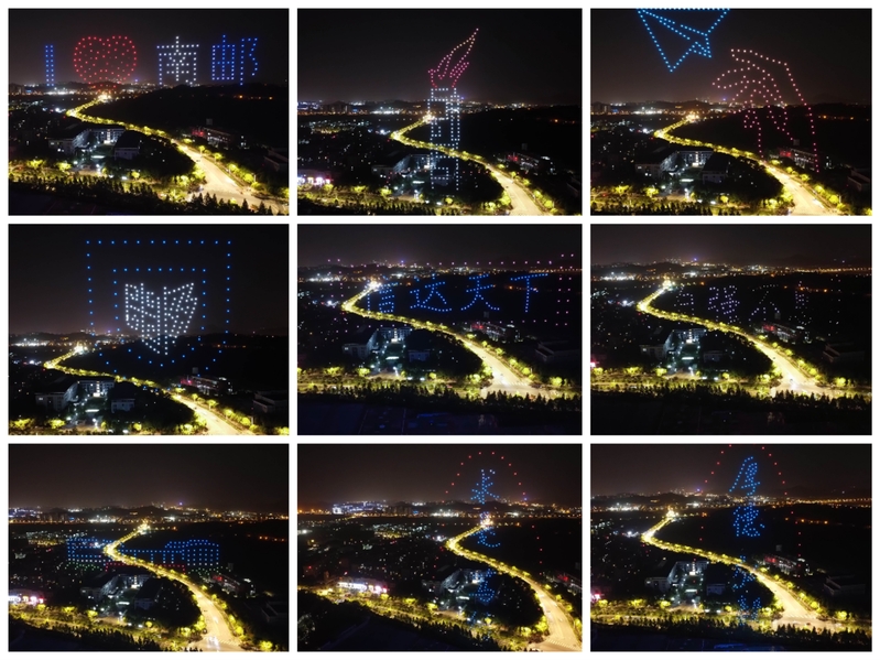 无人机编队表演环节,“信达天下、自强不息、校训石、三好亭、图书馆、学士帽拨穗、行进的高铁列车、放飞纸飞机”等美轮美奂的画面在眼前徐徐展开,用科技手段呈现了南邮精神和标志景点,“不负热爱,奔赴山海”表达了学校对毕业生的浪漫祝福。