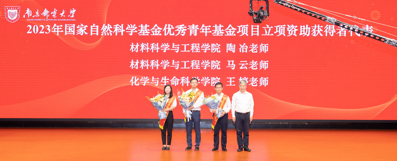 校党委书记郭宇锋为2023年国家自然科学基金优秀青年基金项目立项资助获得者代表陶冶老师、马云老师、王婷老师颁发绶带