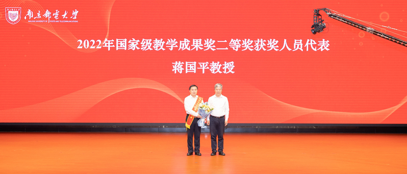 校党委书记郭宇锋为2022年国家级教学成果奖二等奖获奖人员代表蒋国平教授颁发绶带