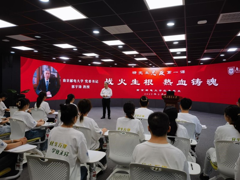 9月13日上午,校党委书记郭宇锋教授在仙林校区教4-211教室为2023级全体研究生新生讲授“思政第一课”,带领3000余名研究生新生学习我校红色校史。授课通过线上线下相结合的方式进行。