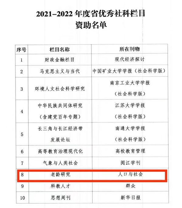 7月11日,省委宣传部下发2021—2022年度省优秀社科学术期刊、优秀社科栏目资助名单,我校《人口与社会》“老龄研究”栏目获评“省优秀社科栏目”,获得资助。