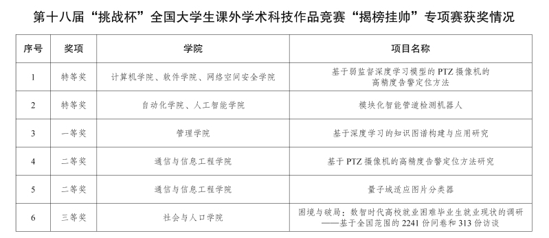 9月21日,团中央发布第十八届“挑战杯”全国大学生课外学术科技作品竞赛“揭榜挂帅”专项赛获奖结果,我校共6个项目参加初赛,并全部入围终审决赛,获特等奖2项、一等奖1项、二等奖2项、三等奖1项。