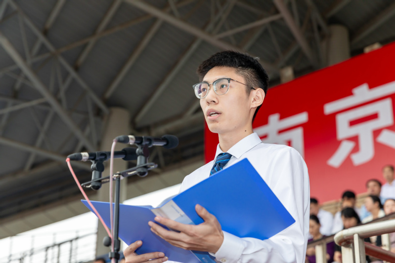 2023级新生代表,地理与生物信息学院本科生周溢同学表达出2023级南邮学子的共同心声,表示将努力融汇基因红、邮电绿、信息蓝三原色,用脚步丈量世界,用心灵感知远方,跨越五洲四海,做新时代的“脊梁”。