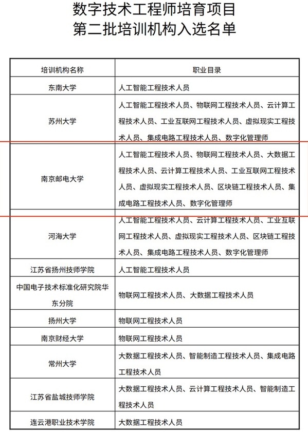 近日,省人力资源和社会保障厅公布“数字技术工程师培育项目第二批培训机构名单”,南京邮电大学成功入选,获批人工智能工程技术人员、物联网工程技术人员、大数据工程技术人员、云计算工程技术人员、工业互联网工程技术人员、虚拟现实工程技术人员、区块链工程技术人员、集成电路工程技术人员、数字化管理师等9个国家数字技术工程师培育项目培训资质。