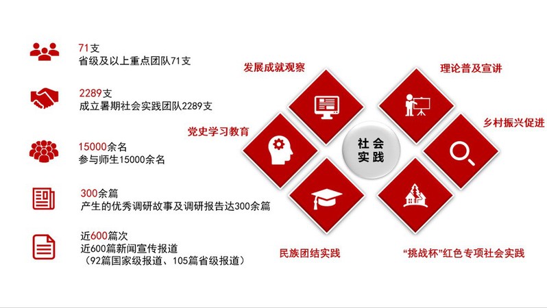 为深入学习贯彻习近平新时代中国特色社会主义思想和党的二十大精神,认真落实习近平总书记关于青年工作的重要思想,今年暑假,学校组织开展了以“学习二十大 永远跟党走 奋进新征程”为主题的大学生暑期“三下乡”社会实践活动。以上好“一堂最大的国情社情思政课”和“一堂最大的专业教育实践课”为目标,共计组建2289支实践团队,其中获批省级及以上重点团队71支。15000余名师生以理论普及宣讲、党史学习教育、乡村振兴促进、发展成就观察、“挑战杯”红色专项和爱校荣校等为主线,厚植爱国情、砥砺强国志、付诸报国行。相关社会实践成果被《光明日报》《中国青年报》、人民网、中国青年网、新华网、央广网等各级媒体宣传报道近600篇。