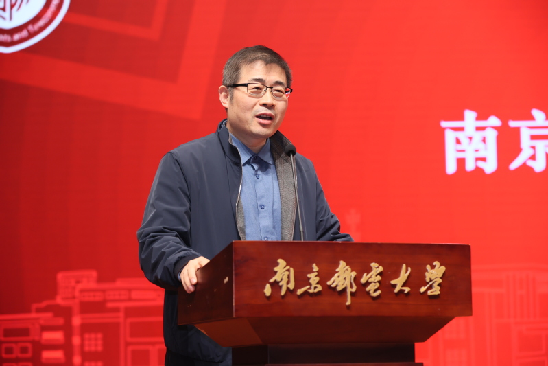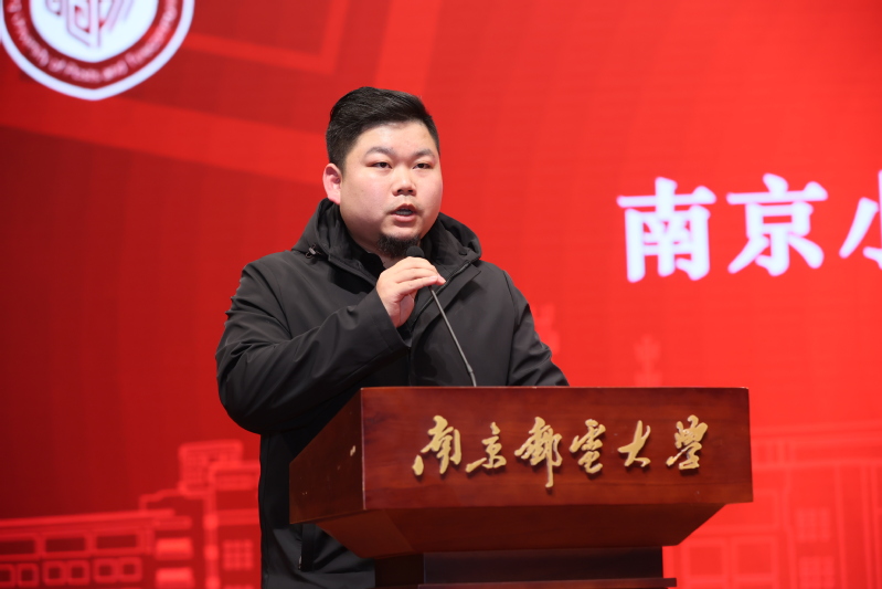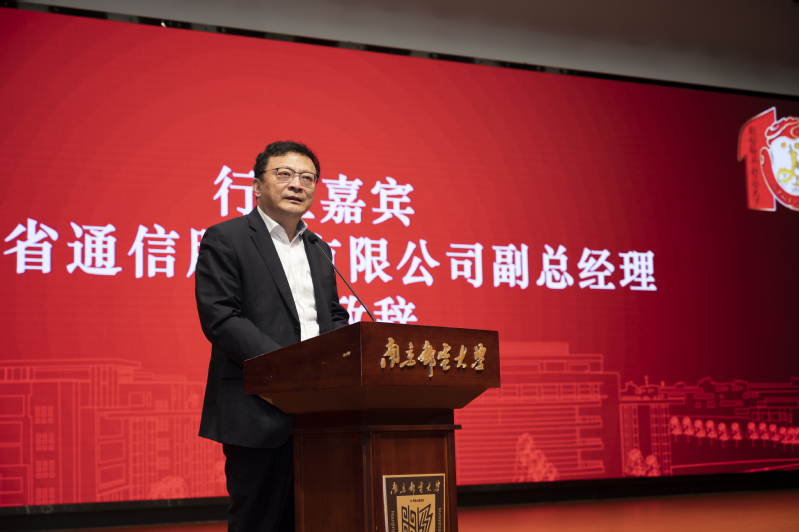 江苏省通信服务有限公司陶军副总经理致辞,表达对经济学院成立十周年的真挚祝福。他介绍了江苏通服的发展历史,讲述了江苏通服与南京邮电大学在产教融合方面采取的新举措,希望未来能与经济学院一起打造共同培养、专项提升、定向就业的共生型人才培养模式,努力培养出素质高、能力强、技术过硬的优秀人才。