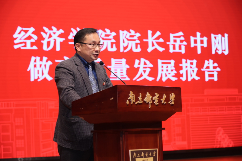 经济学院院长岳中刚作高质量发展报告,介绍了南邮经济学科起源及学院发展历程,讲述了近十年学院在学科专业建设、课程体系设计、人才培养探索等方面取得成绩。经济学院这十年,是转型发展、勇攀一流的十年,是提升规模、追求卓越的十年,是创新引领、屡结硕果的十年。展望未来,全体经院人将以建成电子信息领域特色鲜明的世界一流大学为目标,努力奋进,把握数字技术蓬勃发展引领第四次科技革命带来的重大发展机遇,以新一代信息技术、数字技术作为强有力的基石,努力将学院建设成为国内知名、若干领域达到国内一流的经济学院。