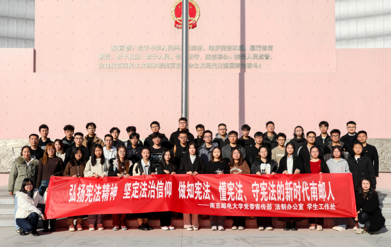 实践活动树信仰。12月7日,校党委宣传部、法制办公室、学生工作处相关工作人员和通信与信息工程学院、化学与生命科学学院、物联网学院、现代邮政学院学生代表赴南京宪法公园开展宪法主题实践活动。在宪法宣誓广场,高高挂起的“推动宪法实施”“深入学习贯彻习近平法治思想”宣传标语映入眼帘,景墙上的浮雕深深镌刻了在历史行进史册中“以人民为中心”的重大主题,同学们纷纷驻足学习,不时交流讨论。在宪法宣传教育展厅,学子们从“寻宪”“制宪”“修宪”“奉宪”四个方面,了解中国共产党带领中国人民制定、发展、完善、实施宪法的伟大历史进程。离开宣传展厅后,学子们在宪法宣誓广场国旗前合影留念,感悟宪法力量,弘扬法治精神。