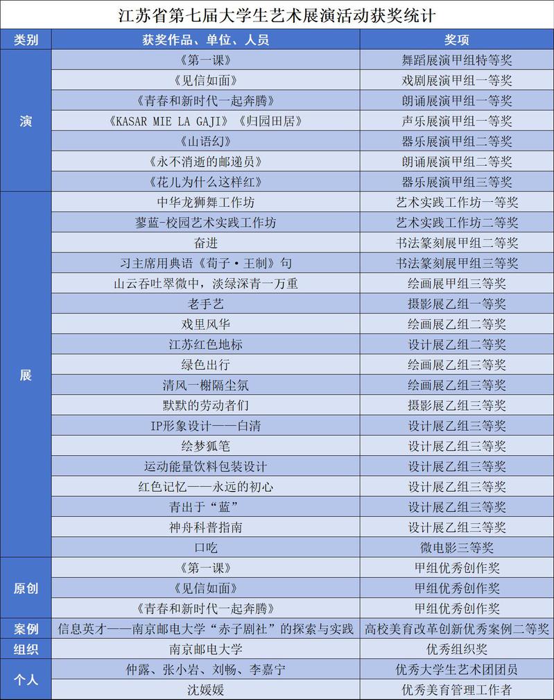 江苏省第七届大学生艺术展演活动获奖统计