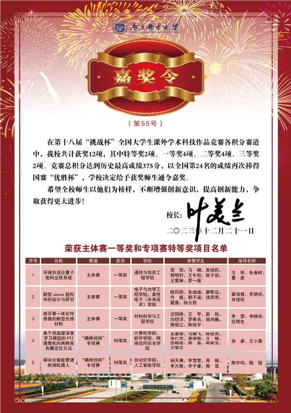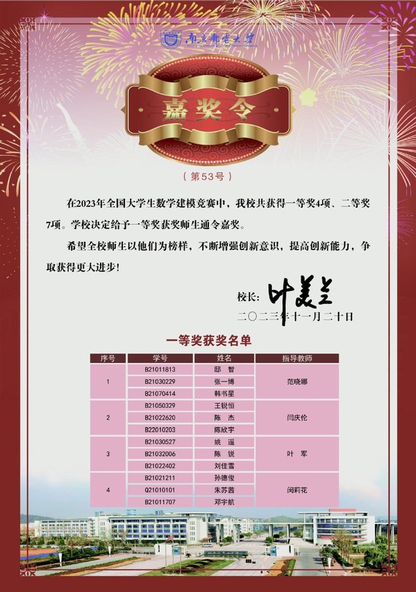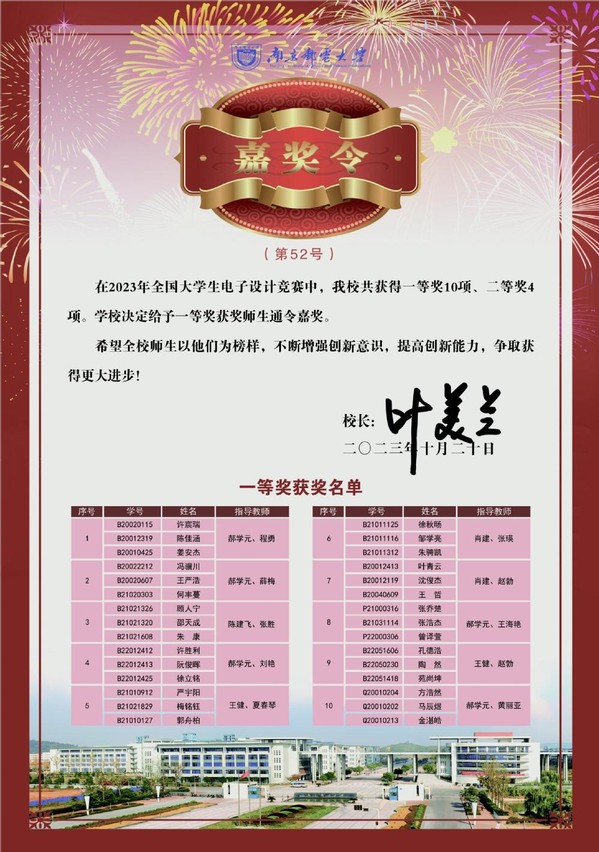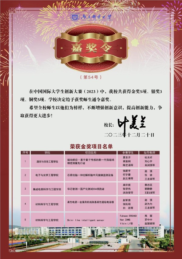 近日,叶美兰校长签发嘉奖令,表彰我校在中国国际大学生创新大赛(2023)、第十八届“挑战杯”全国大学生课外学术科技作品竞赛、2023年全国大学生电子设计竞赛、2023年全国大学生数学建模竞赛等重要学科竞赛中取得佳绩的师生,希望全校师生以他们为榜样,不断增强创新意识,提高创新能力,争取获得更大进步!