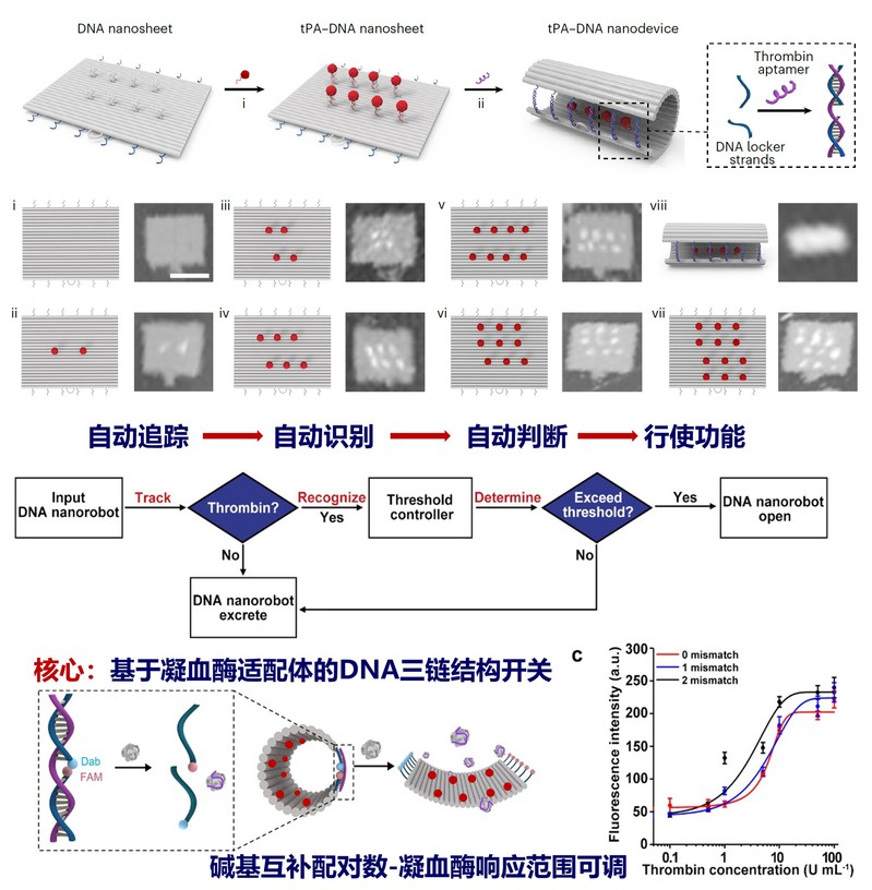 由血栓造成的血管阻塞性疾病已超越癌症成为全球致死率最高的疾病,是危及人类的头号杀手。溶栓治疗是当前临床针对中风、心梗、肺栓塞等急性血栓的首选治疗方案,以组织纤溶酶原激活剂tPA为代表的溶栓药物可激活体内纤溶酶,从而溶解血栓的主要成分纤维蛋白。然而溶栓药物是一把双刃剑,过度激活的纤溶酶会无差别溶解纤维蛋白导致机体凝血功能异常,造成严重的出血并发症而危及生命。因此,实现只针对血栓的精准给药是未来溶栓治疗的发展方向,为更多血栓患者的治疗和康复带来希望。1959年著名物理学家费曼曾预言“可吞下的外科医生”,设想了可注射的微型机器在医学中的应用。DNA纳米技术以人体的四种碱基为基本单元,精确构筑功能模块并通过有序自组装可实现自动执行系列任务的纳米机器。