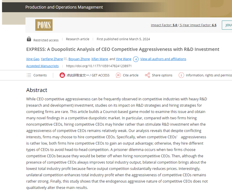 近日,我校管理学院青年教师仲泊远博士与东南大学经济管理学院高星老师等合作,以共同第一作者身份在管理学UTD24期刊Production and Operations Management上发表学术论文“A duopolistic analysis of CEO competitive aggressiveness with R&D investment”。