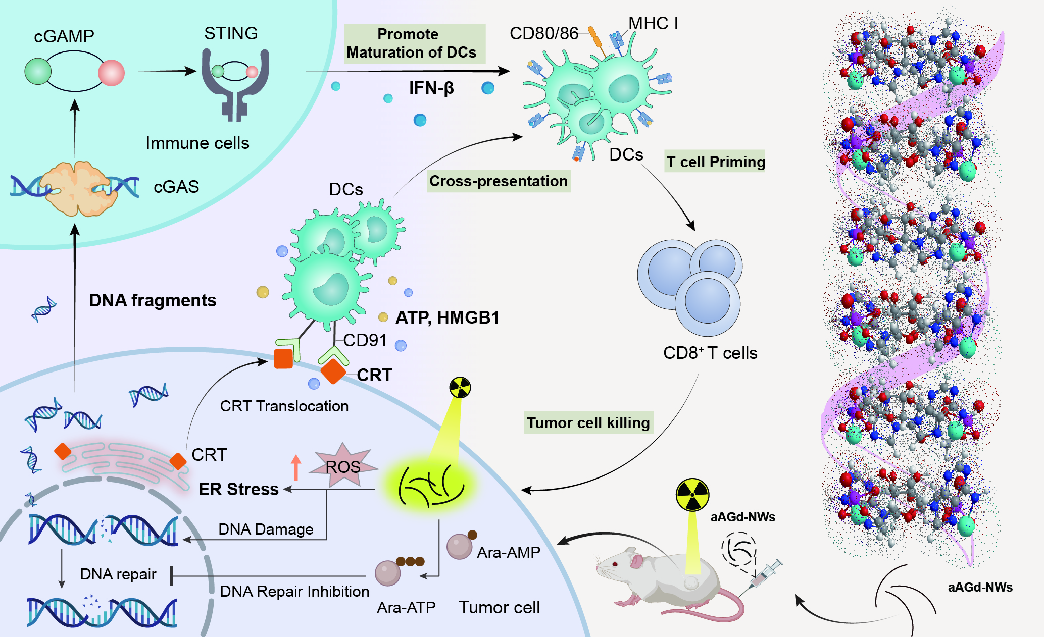 肿瘤的放射治疗相当于接种了内源性原位疫苗,但这种仅由放射治疗引发的内源性原位疫苗的效应非常微弱,几乎不能诱导全身性的抗肿瘤免疫反应。团队基于临床抗病毒药物(单磷酸阿糖腺苷)与核磁造影剂(钆离子)通过配位自组装和相调控技术,开发了手性阿糖腺苷磷酸钆纳米线(aAGd-NWs)来增强放疗诱导的肿瘤原位疫苗效应。在清华大学崔晓亚博士、苏家跃博士和刘涛老师的帮助下,团队通过冷冻透射电镜解析了aAGd-NWs的结构特征,包括超细形貌、表面配位和右手螺旋手性,并阐明了aAGd-NWs手性自组装的机制。在生物机制上,aAGd-NWs不仅增强了X射线沉积和散射,增强放疗的敏感性,而且有效抑制肿瘤细胞DNA的自我修复,有效激活cGAS-STING通路促进I型干扰素的分泌,增加了CD8+ T细胞在肿瘤组织中的浸润。协同免疫检查点阻断疗法显著增强了放疗诱导的原位疫苗效应。