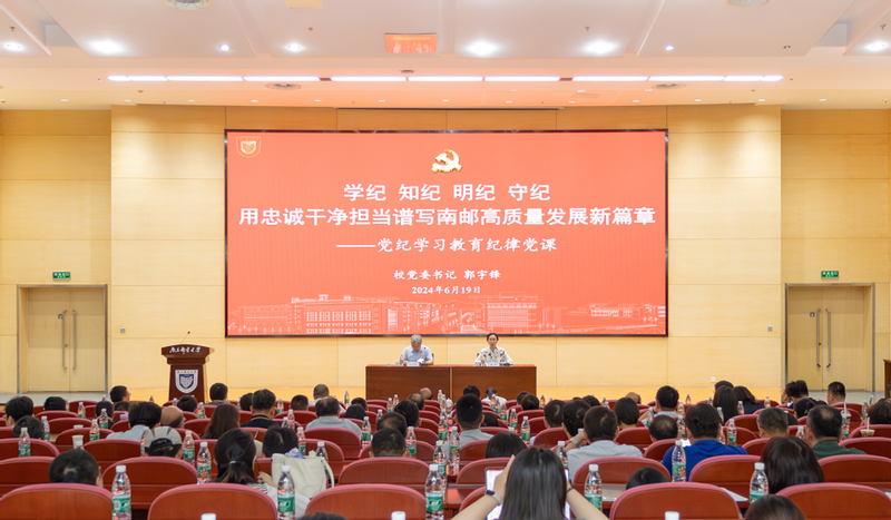 根据学校党纪学习教育工作部署,6月19日下午,校党委书记郭宇锋在仙林校区图书馆报告厅,以《学纪 知纪 明纪 守纪 用忠诚干净担当谱写南邮高质量发展新篇章》为题讲授党纪学习教育纪律党课。校党政领导班子成员、全体中层干部、党支部书记和师生党员代表参加党课学习。校党委常委、副校长、党委组织部部长谢平主持纪律党课。