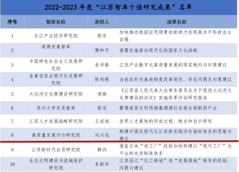 6月20日,省委宣传部发布2022-2023年度“江苏智库研究十佳成果”“江苏智库实践十佳案例”的通报表彰,我校高质量发展评价研究院“打造服务高质量发展考核评价品牌”入选“江苏智库实践十佳案例”,刘兴远研究员等撰写的决策咨询报告《构建中国式现代化江苏新实践评价指标体系的思路和建议》入选“江苏智库研究十佳成果”。