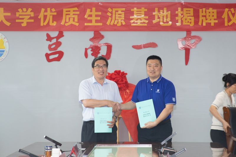 为进一步加强与重点中学的交流合作,7月13日,校党委常委、副校长谢平前往山东省莒南第一中学,举行“优质生源基地”签约揭牌仪式,莒南县委副书记、县长厉伟出席仪式,仪式由莒南县政府副县长马啸霄主持。