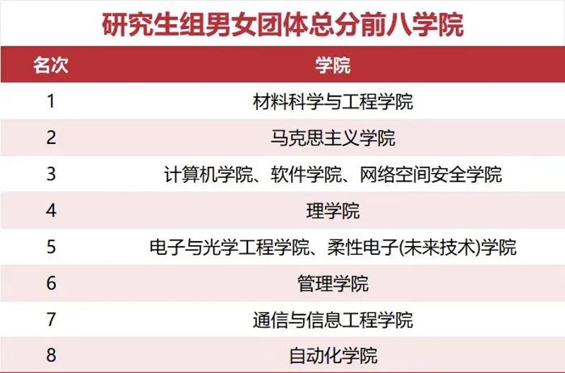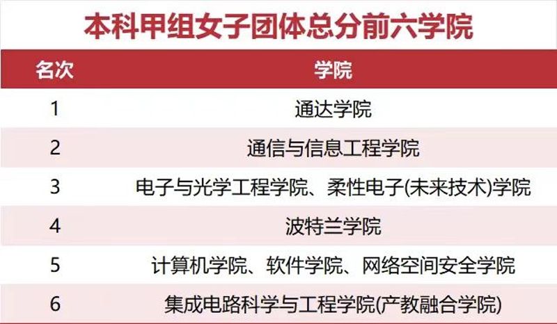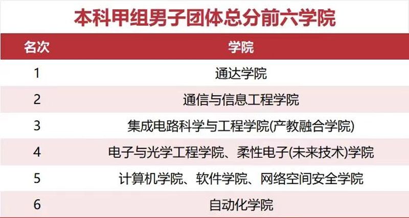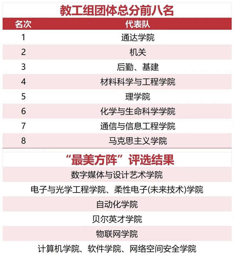 10月25日下午,运动会落幕。材料科学与工程学院荣获研究生男女团体总分第一名,海外教育学院荣获本科女子乙组团体、本科男子乙组团体、本科乙组男女团体总分第一名,通达学院荣获本科女子甲组团体、本科男子甲组团体总分第一名。数字媒体与设计艺术学院,电子与光学工程学院、柔性电子(未来技术)学院,自动化学院,贝尔英才学院,物联网学院,计算机学院、软件学院、网络空间安全学院获评“最美方阵”。