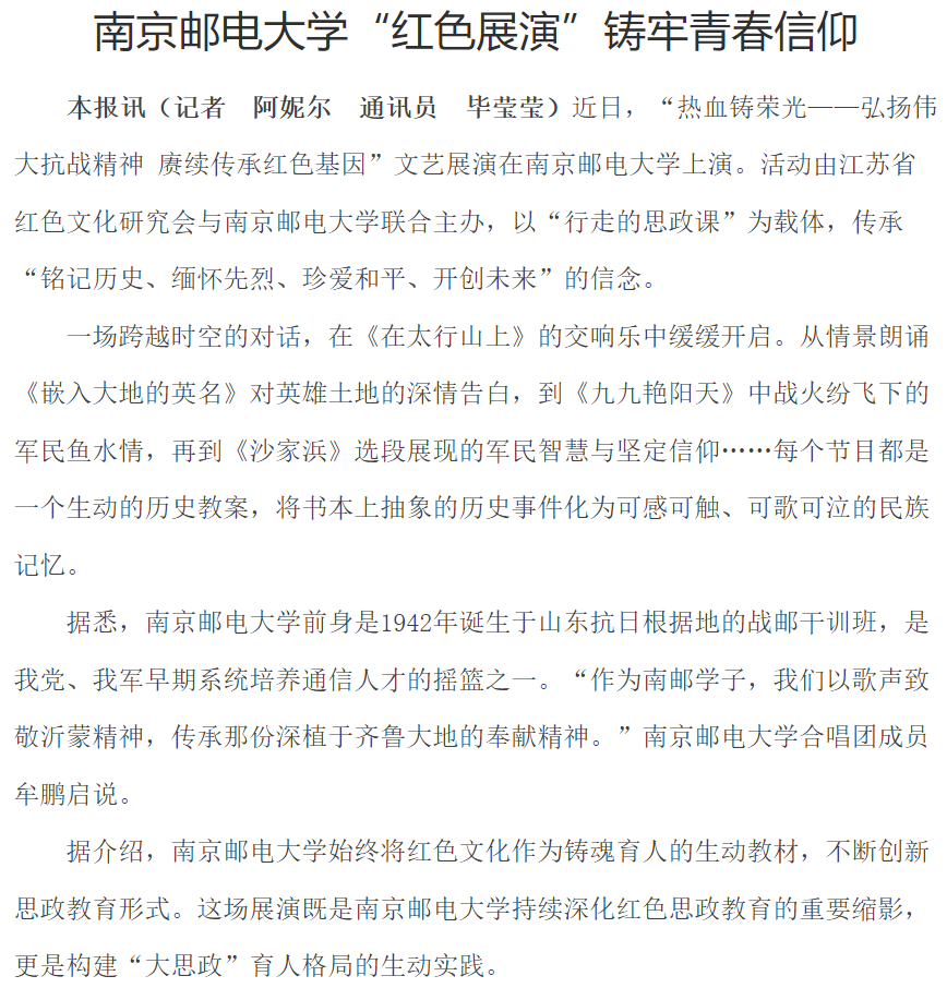 【江苏教育报】南京邮电大学“红色展演”铸牢青春信仰